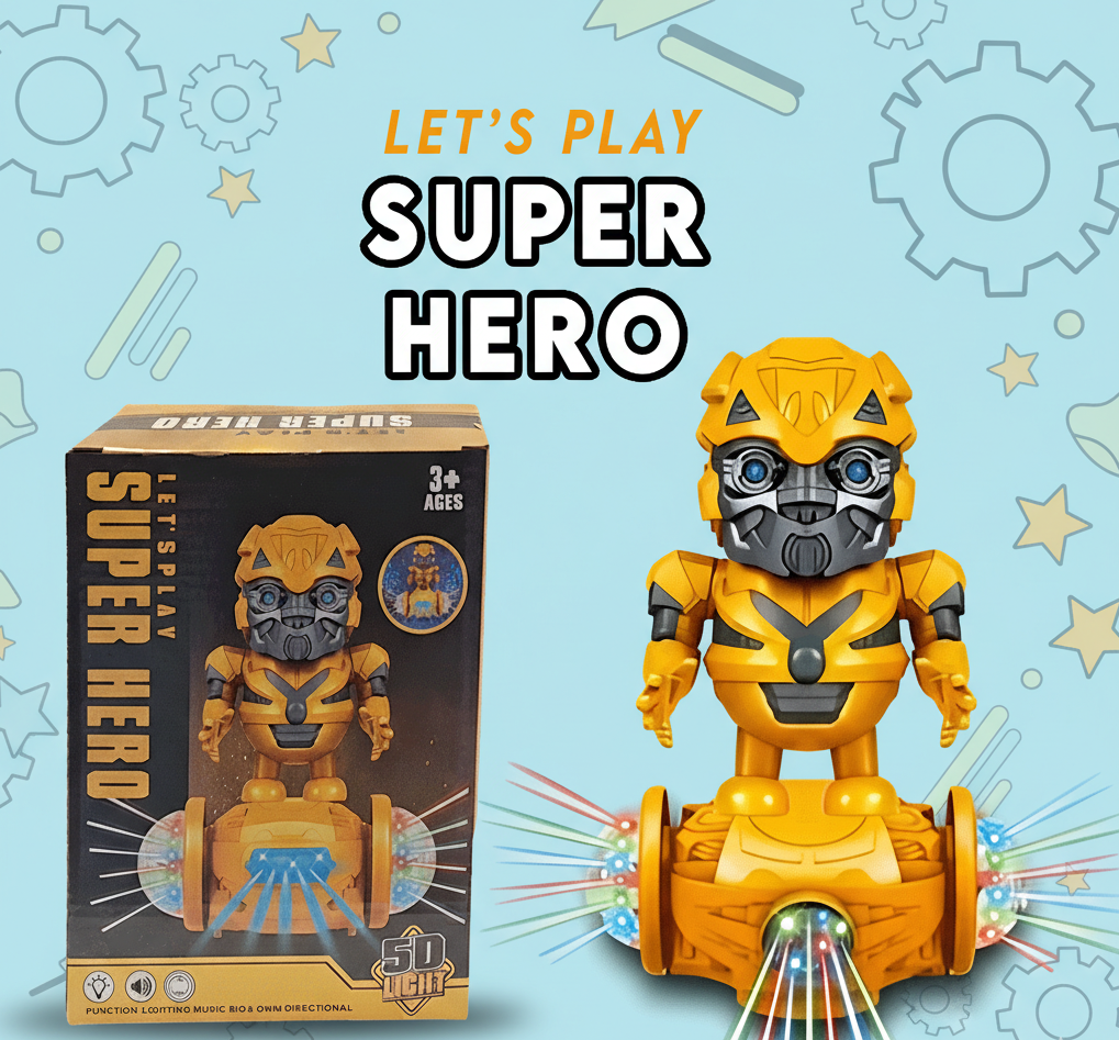 "Let's Play Super Hero" Robot Toy! This vibrant yellow, Transformer-style figure is designed to entertain with its electric dancing motion and universal (omni-directional) wheel function, allowing it to move across floors and turn automatically. The most captivating feature is the 5D Light display, which projects dazzling, colorful patterns from its base while playing engaging music or robot sounds. Perfect for toddlers and children 3+, this musical light-up robot encourages movement, stimulates visual and auditory senses, and provides endless hours of heroic play. It's the ultimate gift for any child who loves Super Hero action and exciting electronic toys!